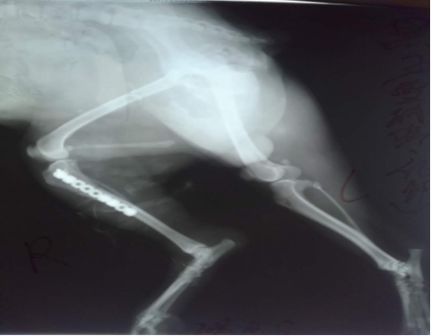雪納瑞大黑被車撞到,導致右后腿無法站立,X光檢查脛骨骨折,在別的醫(yī)院拍完X光后轉到我院進行手術,經過精心手術成功斷端成功對接,剩下的只需要主人的精心呵護***痊愈。也提醒廣大寵物主人一定要看好自己的寵物,不要亂跑以防出現事故。