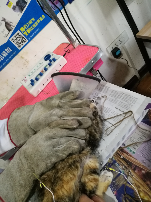 流浪貓小乖瘸腿右后腿遠(yuǎn)端麻痹,尾巴麻痹,現(xiàn)針灸治療。
